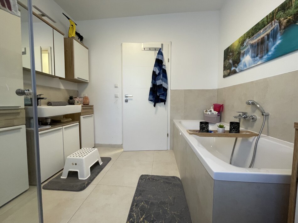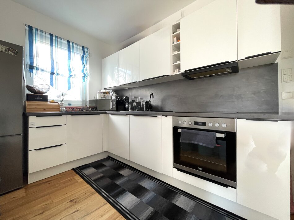 Die hochwertige Einbauküche ist der ideale Ort für kulinarische Experimente und gesellige Kochabende. Das Bad, ausgestattet mit Fenster, Badewanne und Dusche, bietet Ihnen sowohl Erholung als auch Funktionalität. Hier können Sie nach einem langen Tag die Seele baumeln lassen und neue Energie tanken.