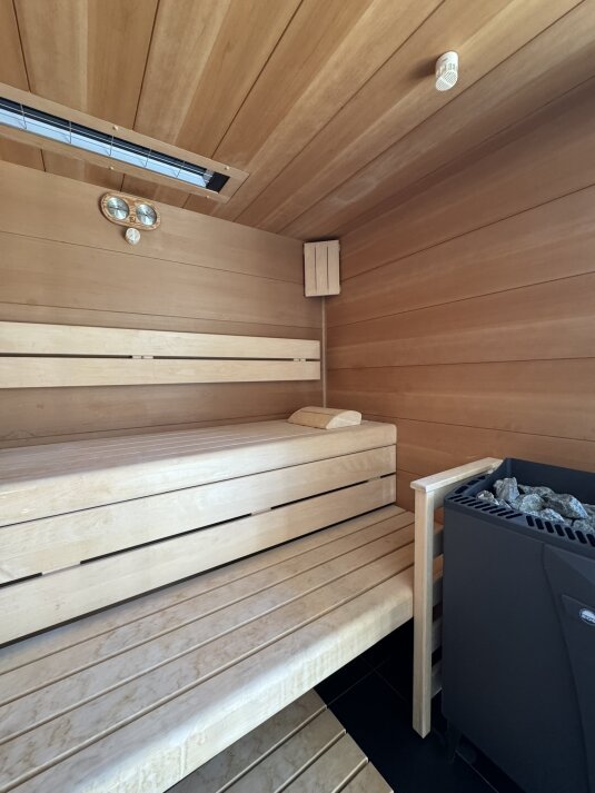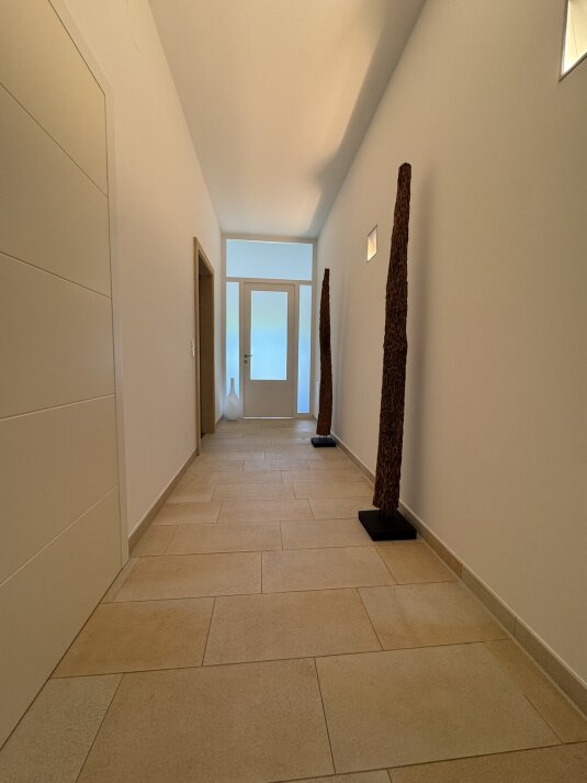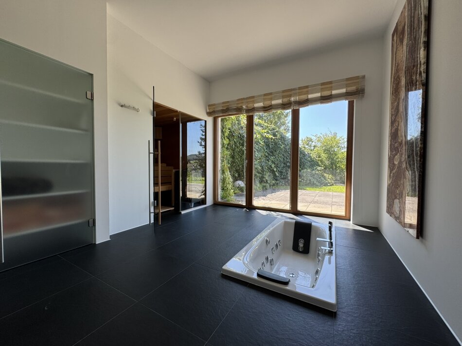 Im Erdgeschoss ist für Entspannung und Lifestyle auf höchstem Niveau gesorgt. Der hauseigene Wellnessbereich verwöhnt Sie mit Sauna, Regendusche, in den Boden integrierter Whirlpool, Heimkino und Weinkeller. Ob Relaxen, Genießen oder Feiern – hier haben Sie alle Möglichkeiten.