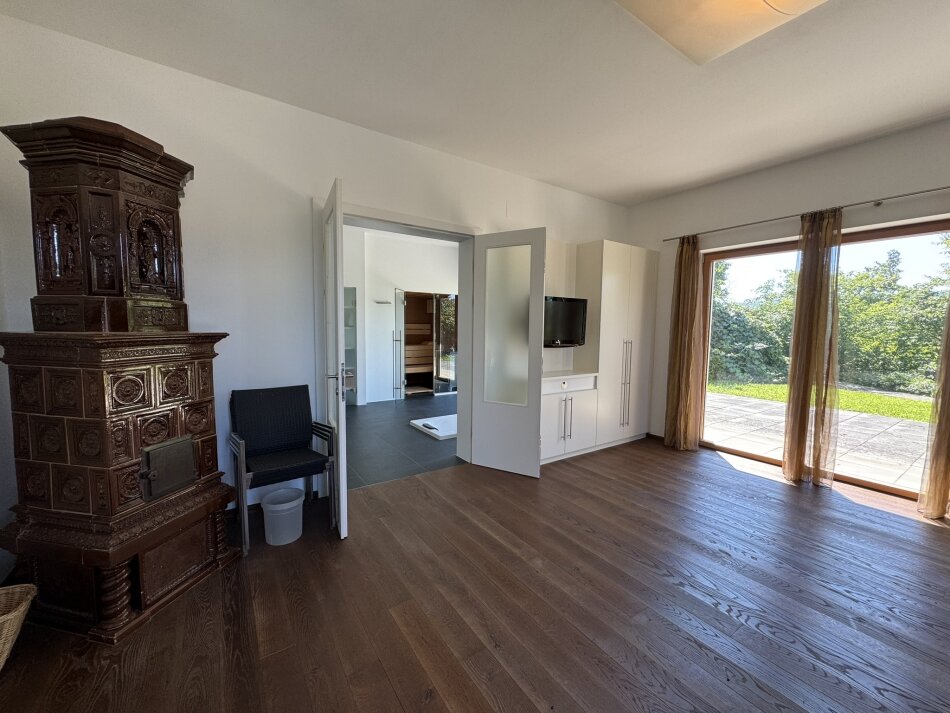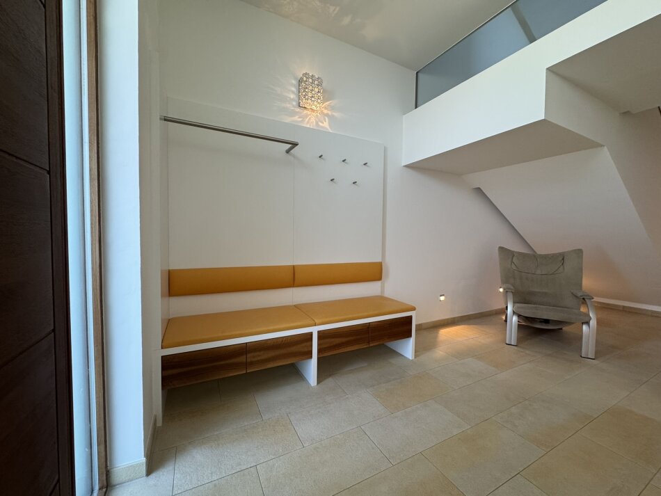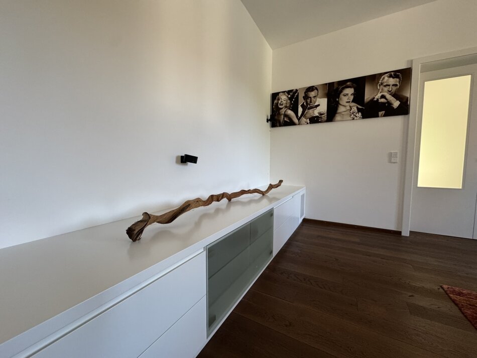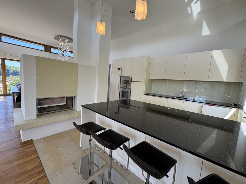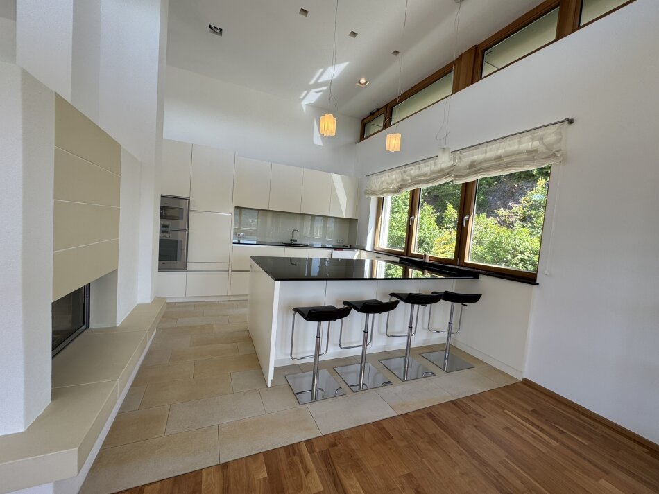 Genießen Sie den offenen Wohn-Essbereich mit hochwertiger Küche ausgestattet mit E-Geräten von Gaggenau und dem beeindruckenden Kaminofen, der mit seinem Flammenspiel von zwei Seiten sichtbar ist. Hier verbinden sich Genuss, Wärme und stilvolle Architektur. In dieser Wohnebene nämlich im 2. OG finden wir noch ein Büro und ein Gäste WC sowie auch einen zweiten Eingangsbereich welcher von der Rückseite des Hauses erreicht wird.