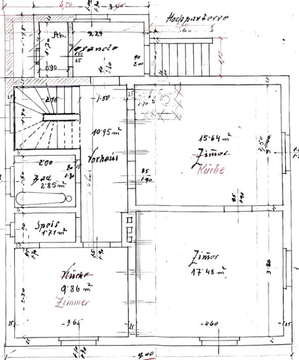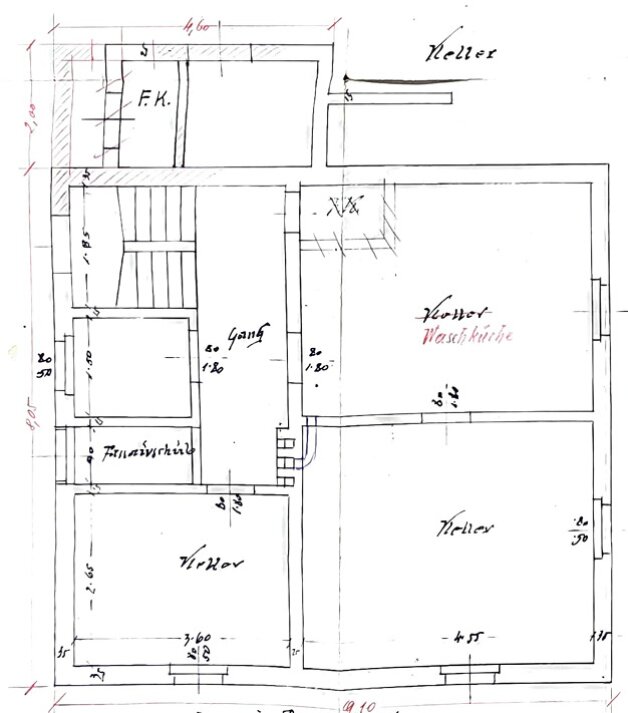 Das bestehende Wohnhaus aus der Nachkriegszeit wird derzeit noch bewohnt und ist funktionstüchtig. Allerdings sind umfassende Sanierungsmaßnahmen notwendig, um heutigen Wohnansprüchen gerecht zu werden. Das Dach befindet sich aktuell im Austausch bzw. in Erneuerung.
