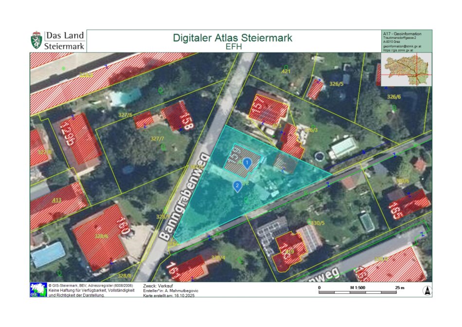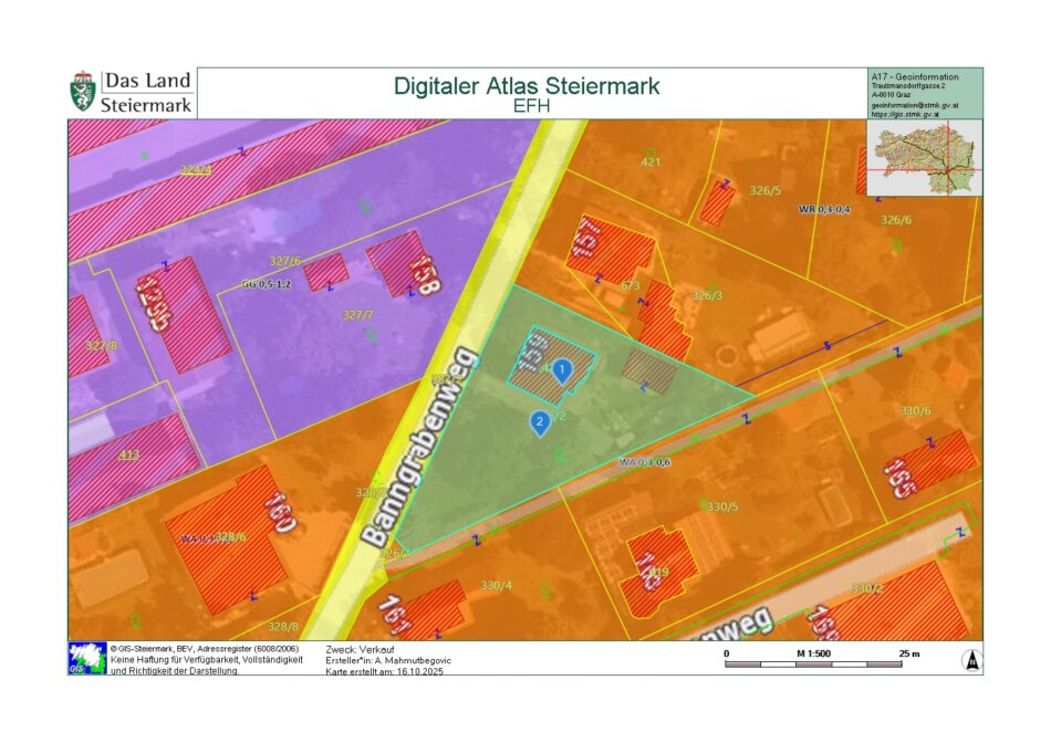 Aufgrund der Widmung WA 0,3–0,6 kann eine erweiterte Bebauung erfolgen – bis zu ca. 492 m² Bruttogeschossfläche bzw. ca. 380 m² Nettofläche, wodurch sich auch die Errichtung von Wohnungen realisieren lässt.