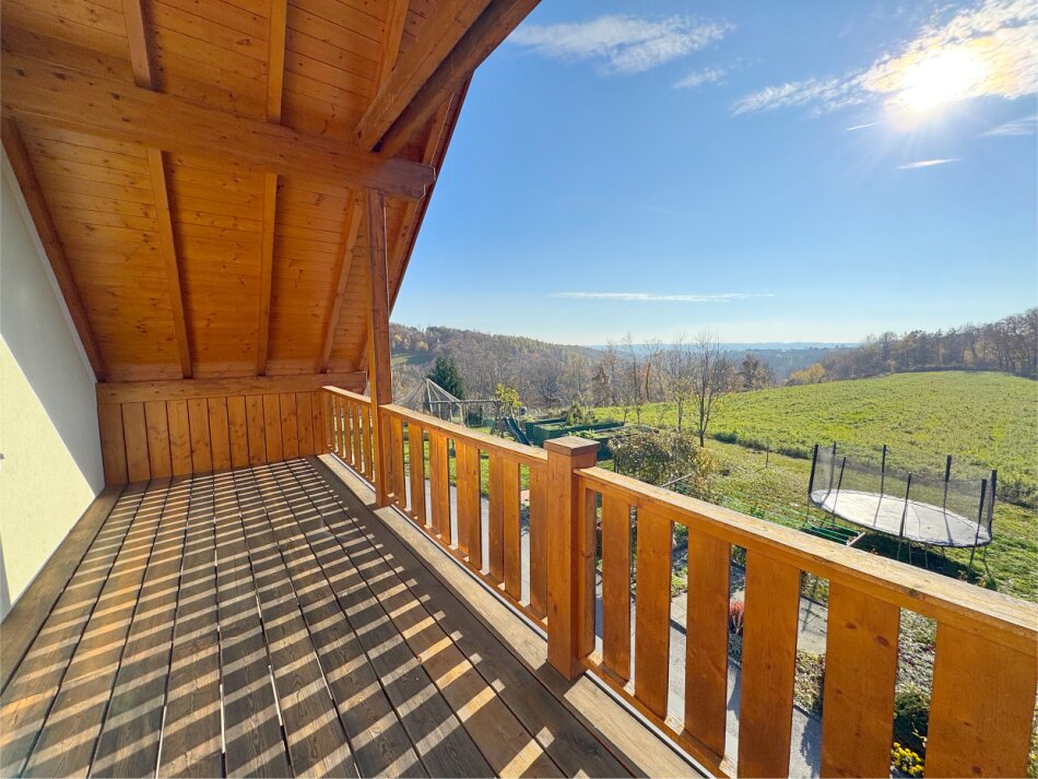 Von den zwei großen Terrassen oder dem Balkon genießen Sie ganztägig Sonne und einen herrlichen Fernblick über die umliegende Landschaft.
