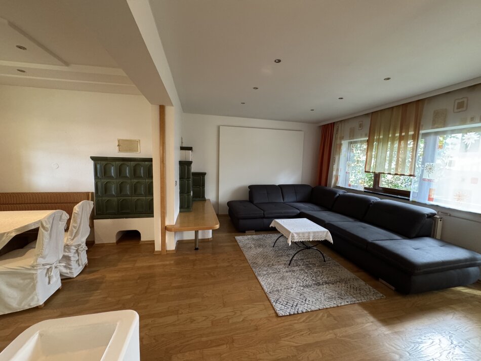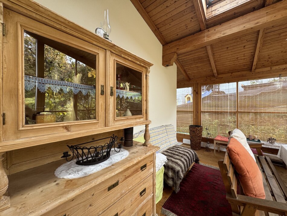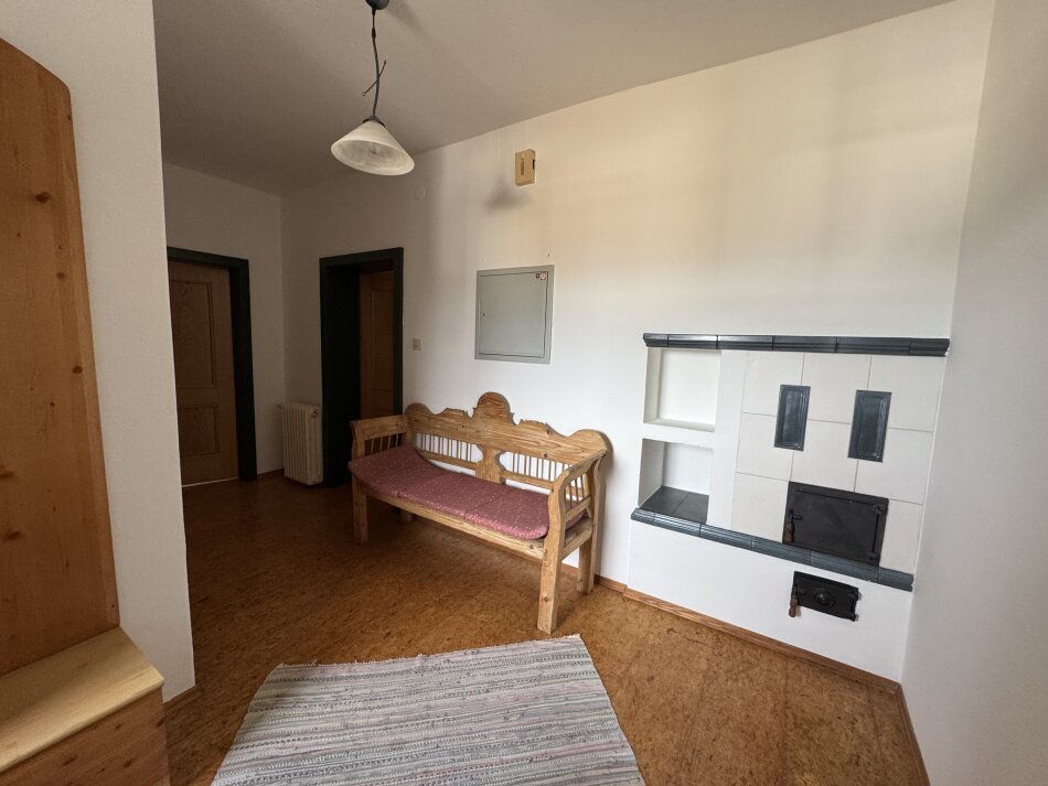 Der Kachelofen, der bequem vom Vorratsraum beheizt werden kann, sorgt im Wohn- und Küchenbereich für wohlige Wärme und eine besonders gemütliche Atmosphäre.