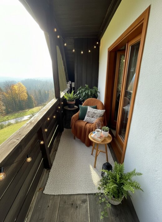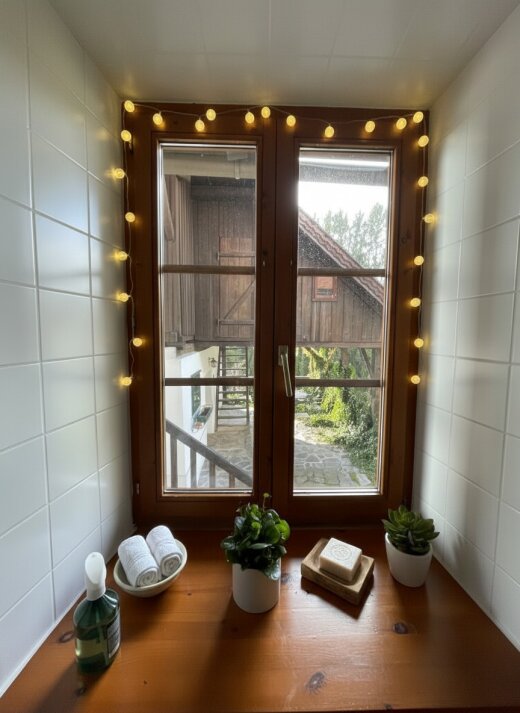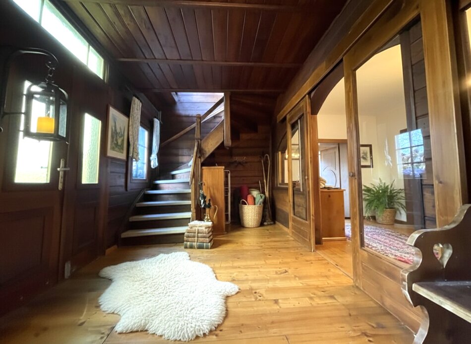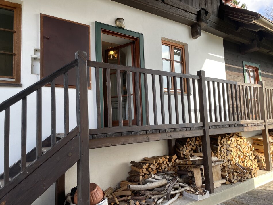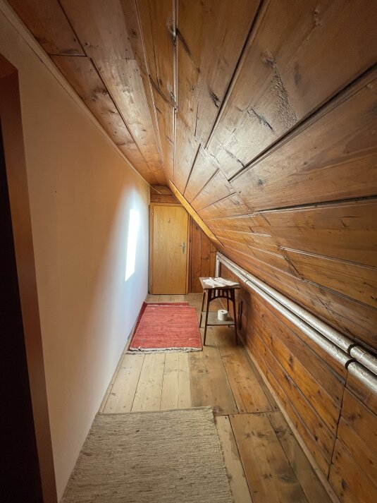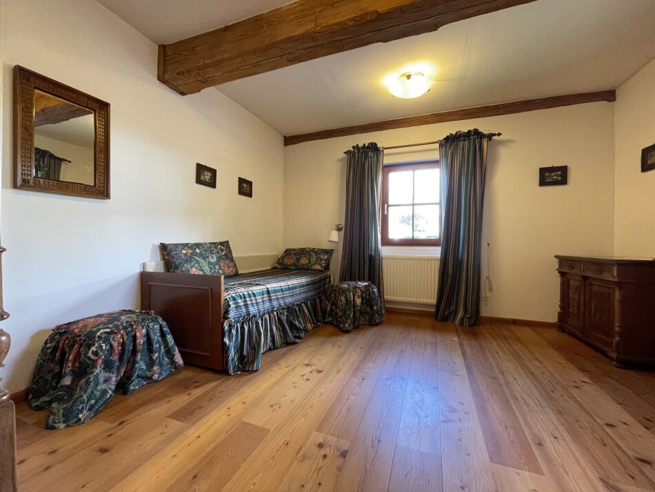 Die Laube im Außenbereich lädt dazu ein, warme Sommertage im Schatten zu genießen, während zwei Balkone herrliche Ausblicke ermöglichen. Ganz in der Nähe wacht die idyllische Kirche von St. Oswald – ein malerisches Detail, das die einzigartige Atmosphäre des Ortes noch verstärkt.