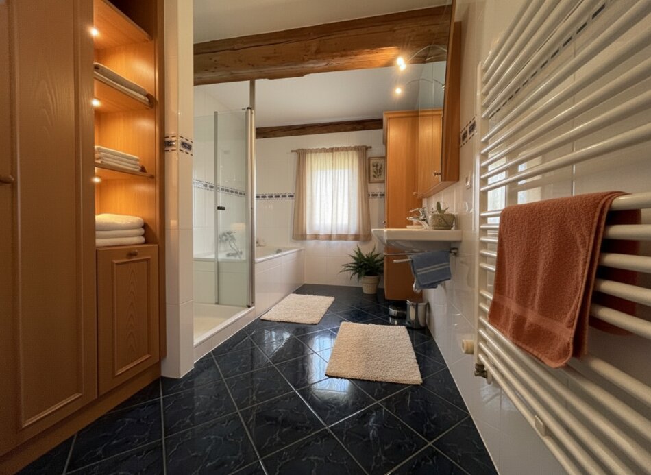 Beheizt wird das Haus über Fernwärme, ergänzt durch zwei behagliche Kachelöfen, die im Winter für wohlige Wärme sorgen. In einigen Bereichen – etwa im Vorraum des Erdgeschosses sowie im Vorraum des Obergeschosses, welches sich wunderbar als Büro, Galerie oder gemütliches Lesezimmer eignet – könnte die Heizung mit modernen Infrarotpaneelen geschmackvoll ergänzt werden.