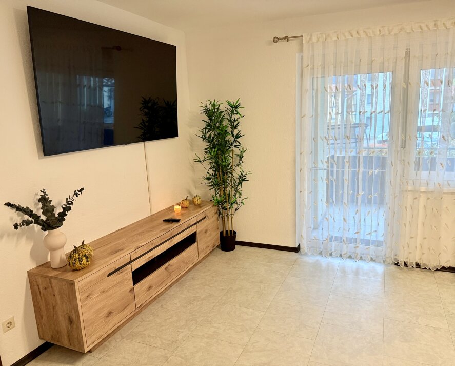 Der offene Wohnbereich ist das Herzstück der Wohnung – hell, großzügig geschnitten und stilvoll eingerichtet. Die moderne Wandgestaltung, der große TV-Bereich sowie die hochwertige Couch schaffen eine einladende Atmosphäre. Von hier gelangt man direkt auf die südwestlich ausgerichtete Loggia, die mit ihrem Blick ins Grüne perfekt zum Entspannen geeignet ist. Hochwertige Outdoor-Möbel und ein gepflegter Bodenbelag verwandeln diesen Bereich in ein zweites Wohnzimmer im Freien. Über eine kleine Treppe erreicht man zusätzlich