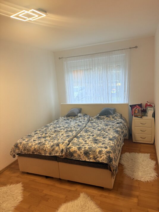 Das geräumige Schlafzimmer bietet ausreichend Platz für ein großes Bett, Kleideraufbewahrung und eine kleine Wohlfühl-Ecke. Das große Fenster sorgt für viel Tageslicht und einen angenehmen Blick ins Freie. Der hochwertige Holzboden schafft Wärme und ein ruhiges Raumgefühl.