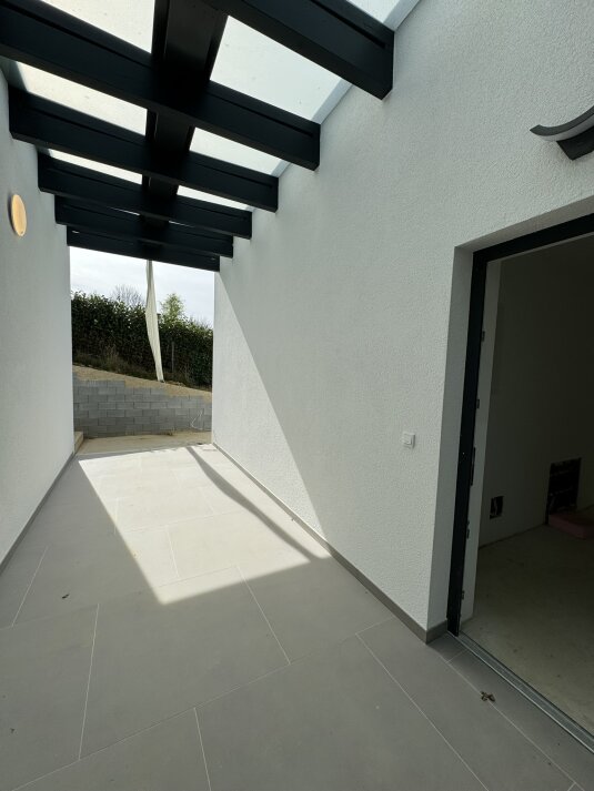 Erdgeschoß: Eingangsbereich, Badezimmer mit Fenster, Waschbecken und Dusche, offene Wohn-Ess-Küchenbereich mit Zugang auf die große Süd-West Terrasse.