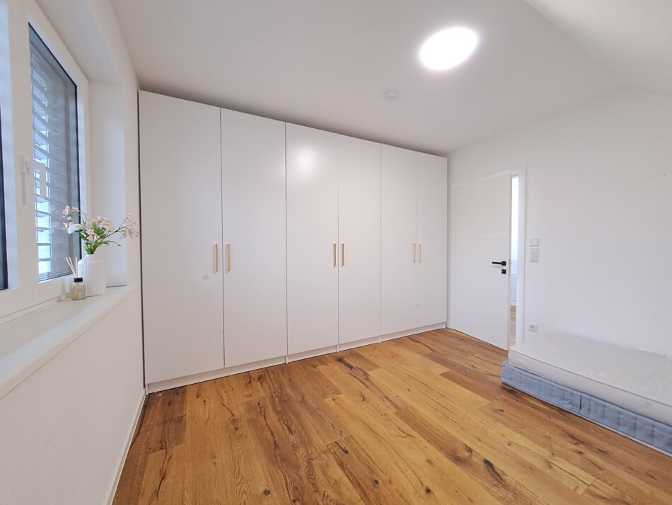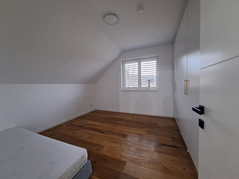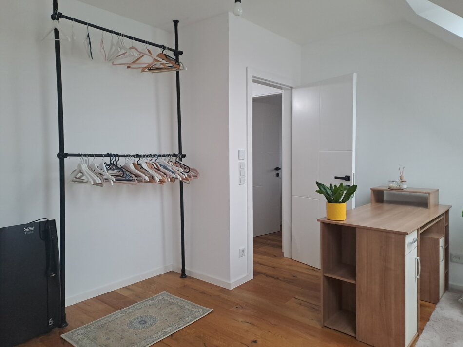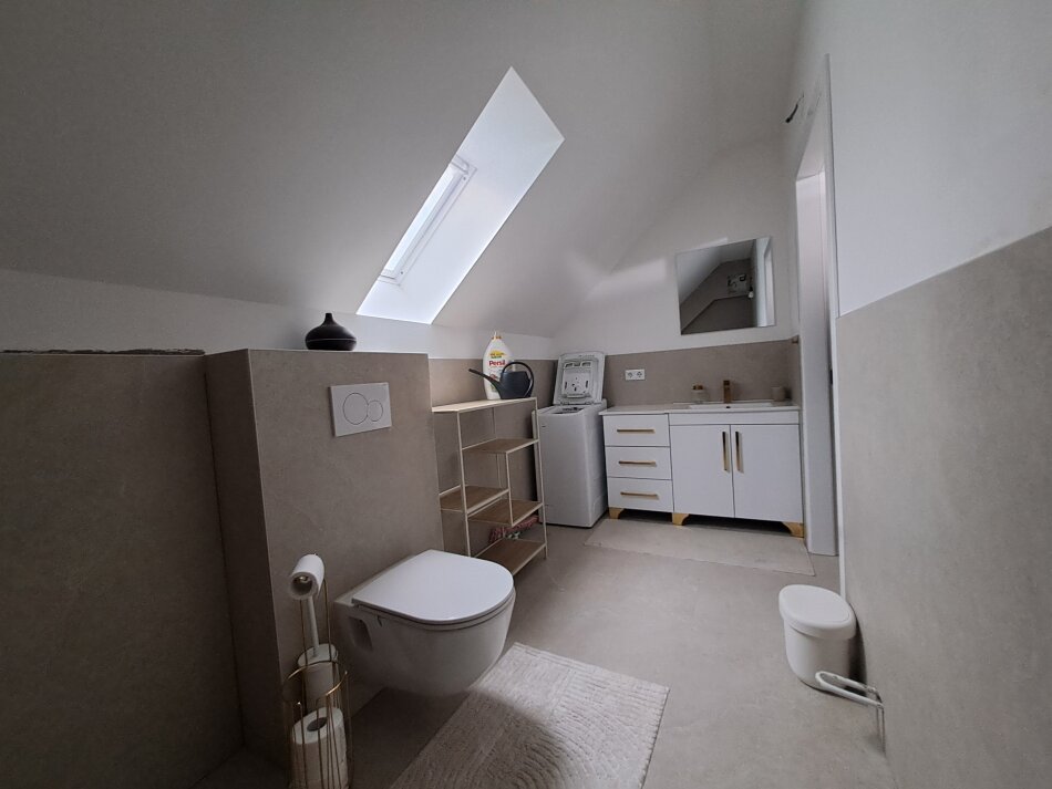 Dachgeschoß: Vorraum, Badezimmer mit Fenster, Waschmaschinenanschluss und Waschbecken, 2 Kinderzimmer und ein großes Elternschlafzimmer.