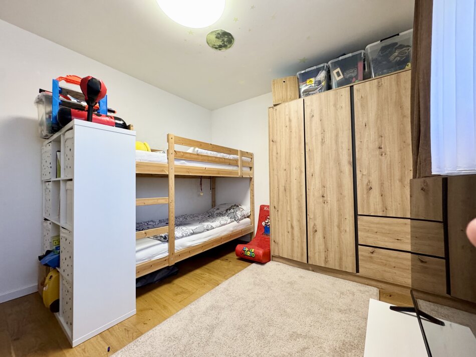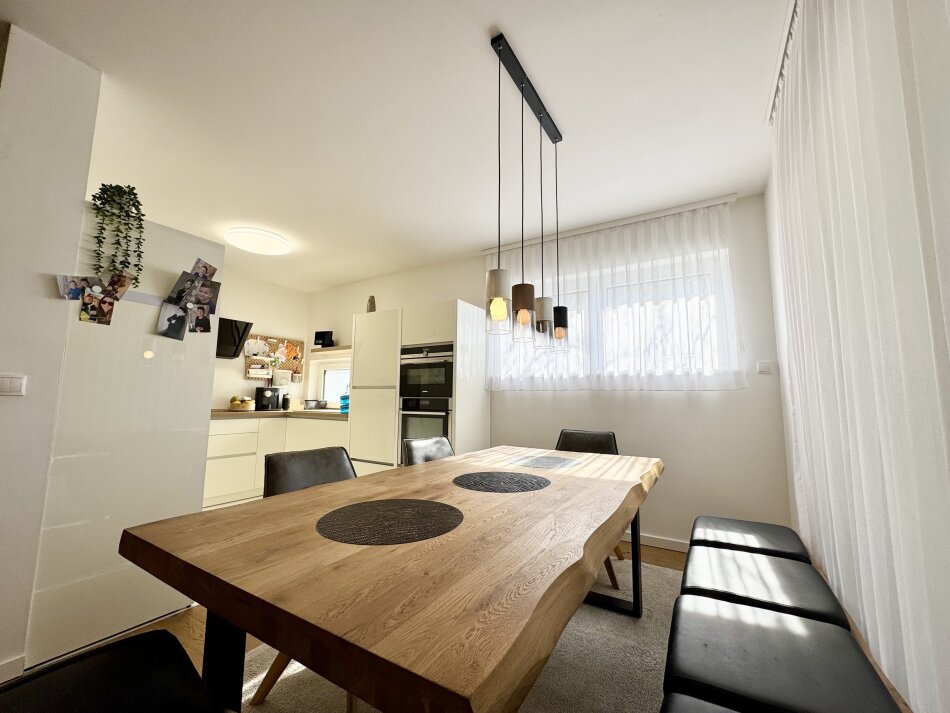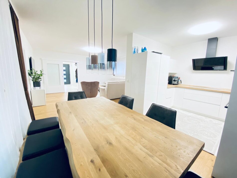 Großzügige Schiebetüren sorgen für ein offenes Wohngefühl und einen harmonischen Übergang in den 108 m² großen Privatgarten – ideal für entspannte Stunden im Freien.