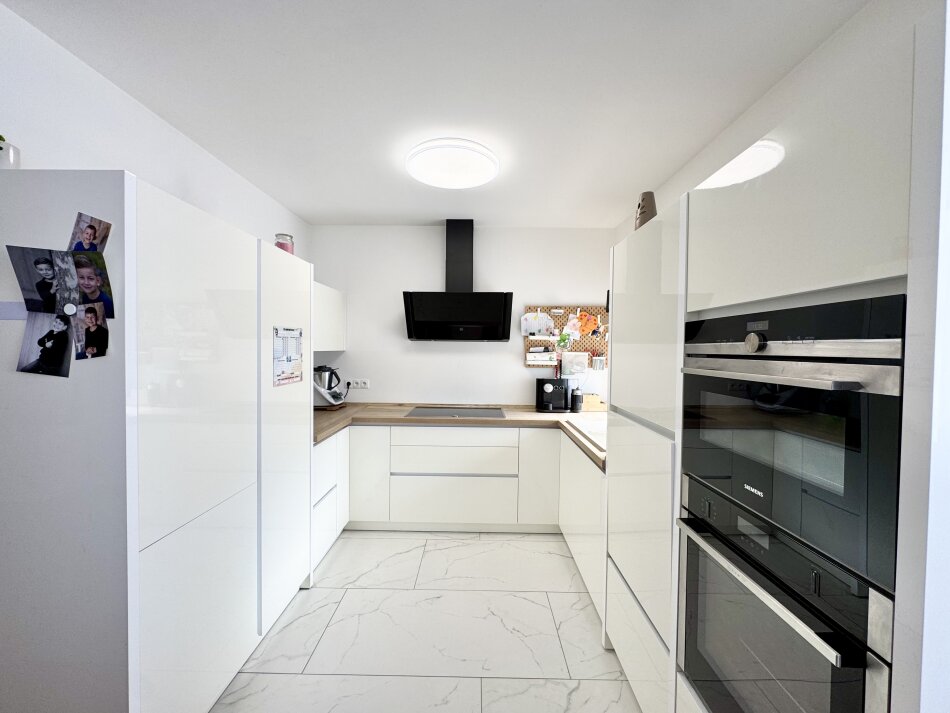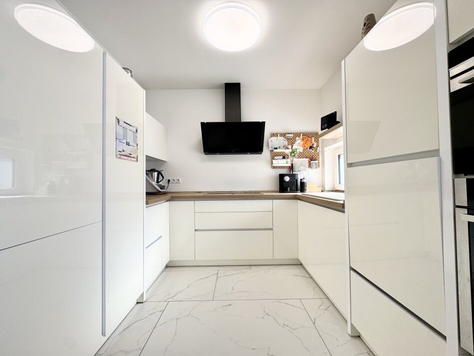 Das Herzstück bildet die maßgefertigte Tischlerküche mit durchdachter Ausstattung: