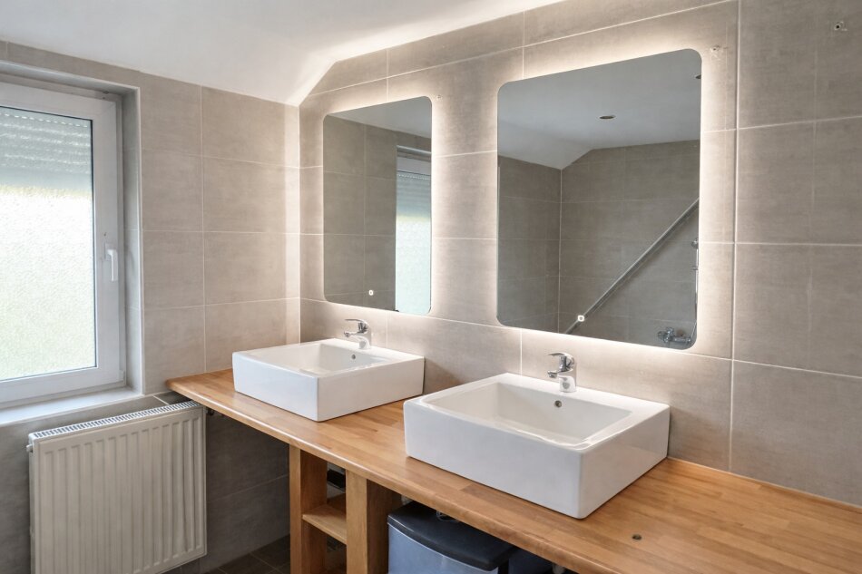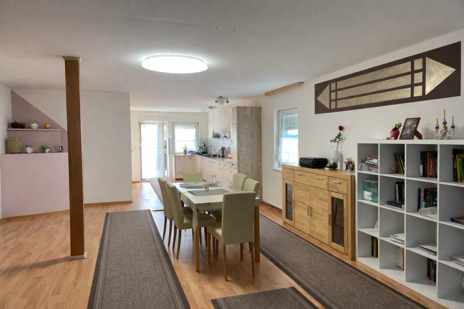 Besonders hervorzuheben sind die zwei stilvollen Bäder, jeweils mit Fenster, Badewanne und Dusche ausgestattet, sowie drei WCs – ideal für den Alltag und für Gäste. Die moderne Einbauküche lädt zum gemeinsamen Kochen und Essen ein und