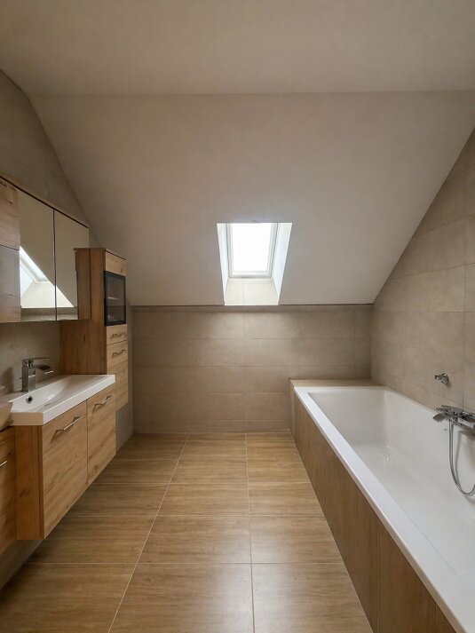 Die untere Wohnebene bietet ca. 91 m² Wohnfläche und überzeugt mit einer angenehmen, wohnlichen Raumaufteilung. Hier befinden sich ein Schlafzimmer, ein Wohnzimmer, ein Esszimmer, eine Küche, ein Badezimmer sowie ein getrenntes WC. Besonders attraktiv ist der direkte Zugang zur Terrasse bzw. in den Garten, der dieser Ebene eine offene und einladende Wohnatmosphäre verleiht.