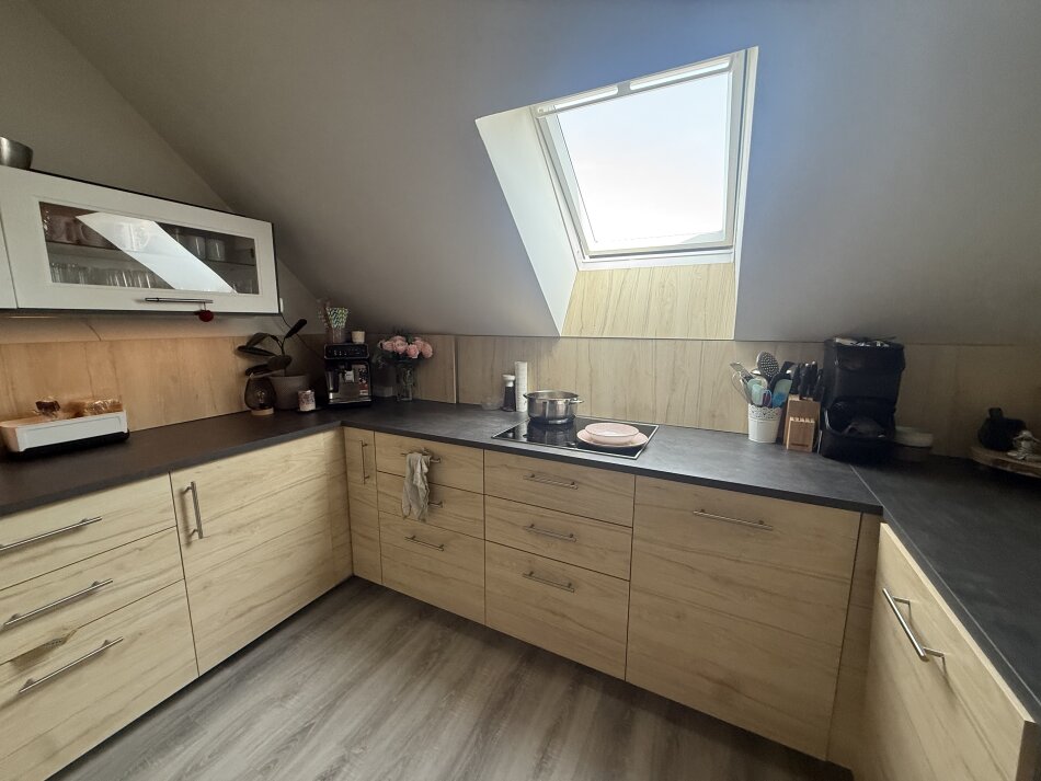 Die obere Wohnebene verfügt über ca. 113 m² und bietet viel Platz für Familie, Gäste oder individuelle Wohnkonzepte. Sie besteht aus einem Vorraum, einem Wohnzimmer, drei Schlafzimmern und einer Küche. Besonders hervorzuheben sind hier die zwei Loggien und zwei Balkone, die dieser Etage zusätzlichen Freiraum schenken und den herrlichen Blick ins Grüne und in die Weite auf besondere Weise erlebbar machen.